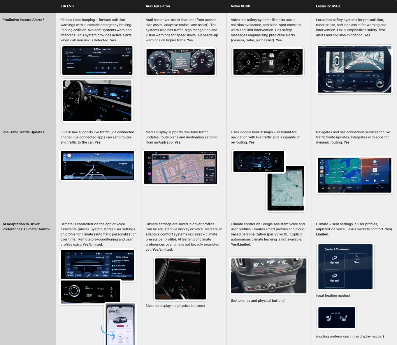 Before touching Figma, I spent two months studying automotive display standards, safety regulations, and real in-car interfaces. I analyzed displays across five midsize crew-cab trucks: Rivian, Kia, Audi, Volvo, and Lexus. The weakest interfaces shared the same problems: outdated visuals, icons that required guesswork, and features that existed either on screen or as a physical button but never both. That redundancy gap influenced our own design directly.